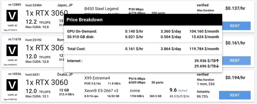 例えば、RTX 3060が1台積まれているマシンは、1時間あたり0.14ドル(約20円)で、50GBのストレージを使うと0.021ドル(約3円)と表示されている。