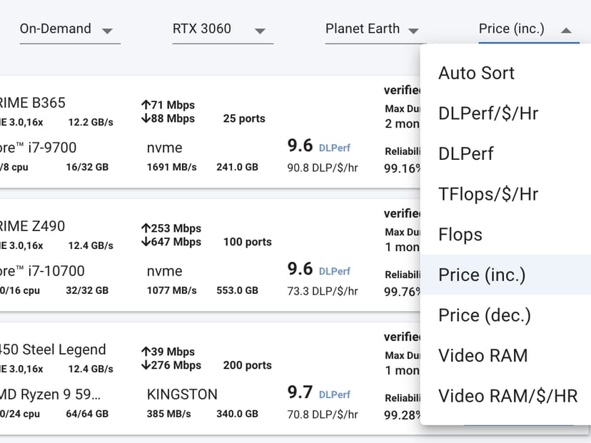 Vast.aiへのログイン後のコンソール画面を開いて、右上のプルダウンリストで、さまざまな検索条件を付ける事ができる。