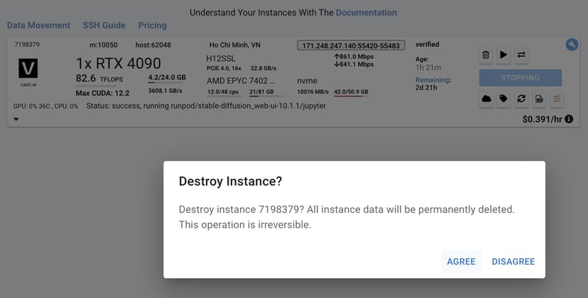 Vast.aiのようなGPUインスタンスのレンタルサービスは、時間単位で課金されるので、使い終わったら必ず返却・破棄する(Destroy)のを忘れないようにする。