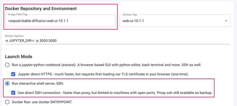 Jupyterのテンプレートを使ってもSSHはできるので、Jupyterの手順と同じLaunch Modeを選択しても良いのだが、今回はあえてハードコアにSSH用のテンプレートで起動する。