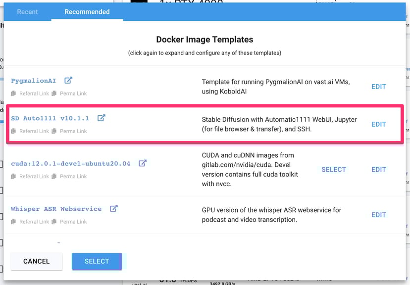 Vast.aiでは、先述の通り、Automatic1111 Stable Diffusion web UIのDocker Imageが用意されている。