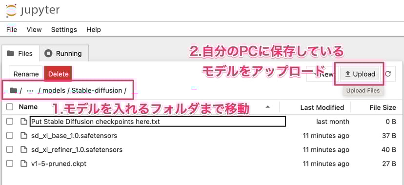 毎回インスタンスを起動するたびに、モデルを手動で一つ一つアップロードし直す必要があるので、少し面倒ではあるが、シェルスクリプトなどを書く必要がなく、初心者でも簡単だ。
