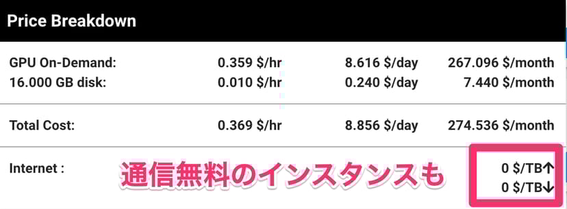GPUの時間料金より、通信料(数十ギガのモデルのダウンロード)の方がお金がかかってしまうこともあるので、大型のファイルを送受信することの多い生成AIでの利用においては、ダウンロード/アップロードの料金が重要なファクターと言えるかもしれない。