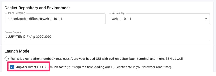 Vast.aiでは、インスタンスを立ち上げる際に、「Jupyter direct HTTPS」というオプションのチェックボックスがある。