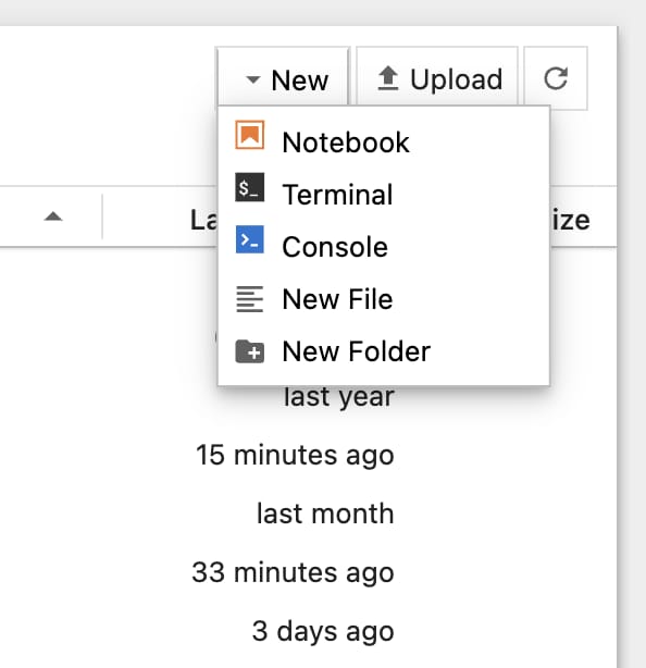 先ほどのJupyterのインターフェース上で、右上にある「New」ボタンをクリックすると、リモートマシン上で様々なコマンドを打つことのできる「ターミナル」を起動できる。