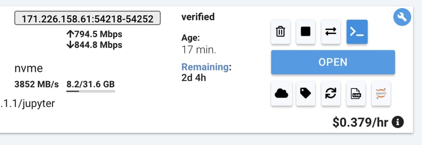 Vast.aiの先ほど起動したインスタンスで、SSH情報の確認を行う。例えばSSH接続用に以下のようなアドレス・ポートが表示されたとする。
