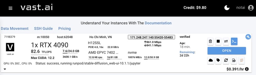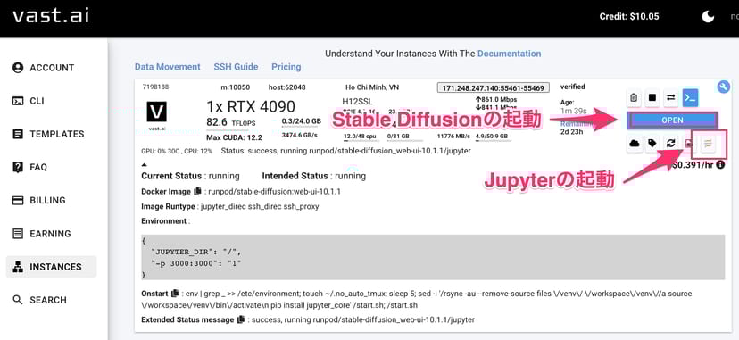 アップロードが完了したら、先ほどのVast.aiのInstancesのページに戻り、「OPEN」をクリックすると、Stable Diffusionが立ち上がる。