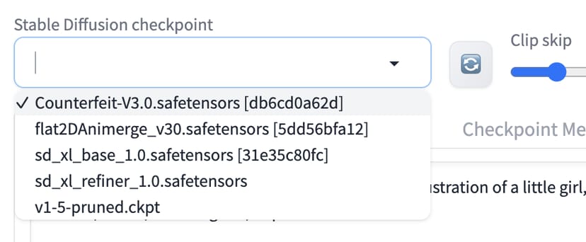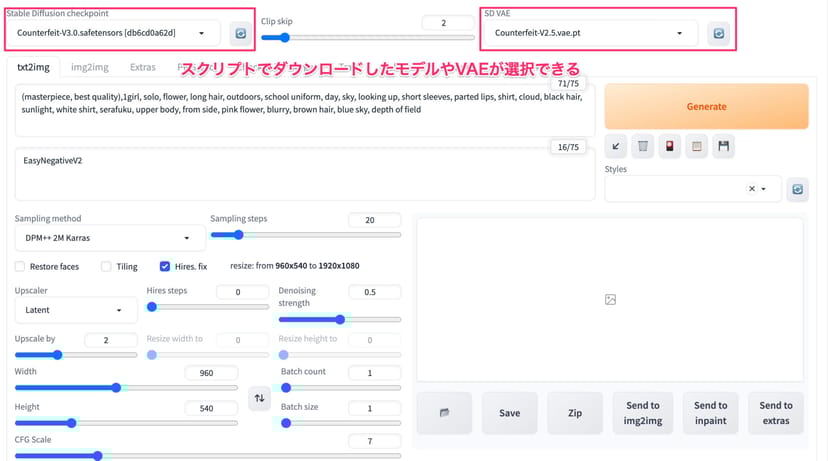 先ほどダウンロードしたCounterfeit-V3.0のモデルチェックポイントや、VAEの選択ができるようになっているはずだ。