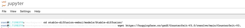 cd /workspace/stable-diffusion-webui/models/Stable-diffusion/wget https://huggingface.co/gsdf/Counterfeit-V3.0/resolve/main/Counterfeit-V3.0.safetensors特にStable Diffusionのモデルなど、大容量なファイルはこの方法でダウンロードすることをお勧めする。