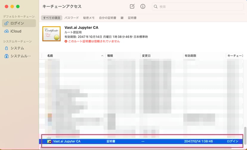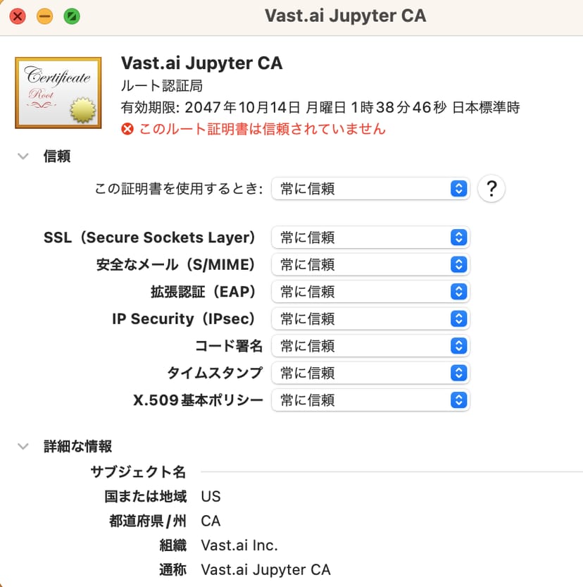 赤いバツが表示されているVast.aiの証明書を見つけ、ダブルクリックした上で、開いた画面上で信頼の設定を「常に信頼」に切り替える。