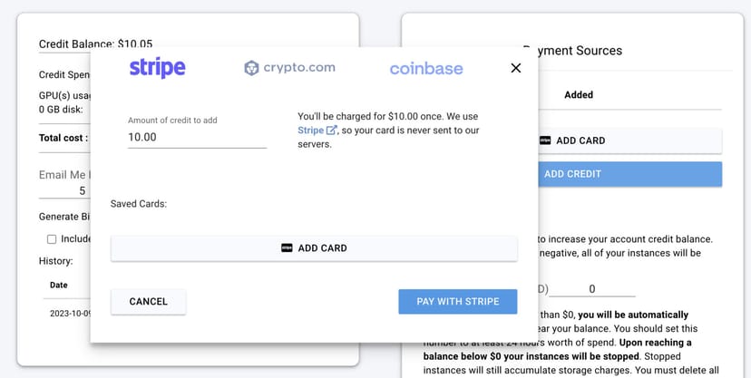 メニューからBilling > Add Creditで、Vast.aiに直接クレカを登録しなくても、stripeで支払えるので、セキュリティ上も若干の安心感がある。
