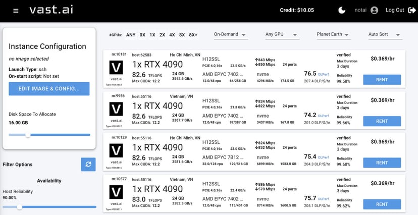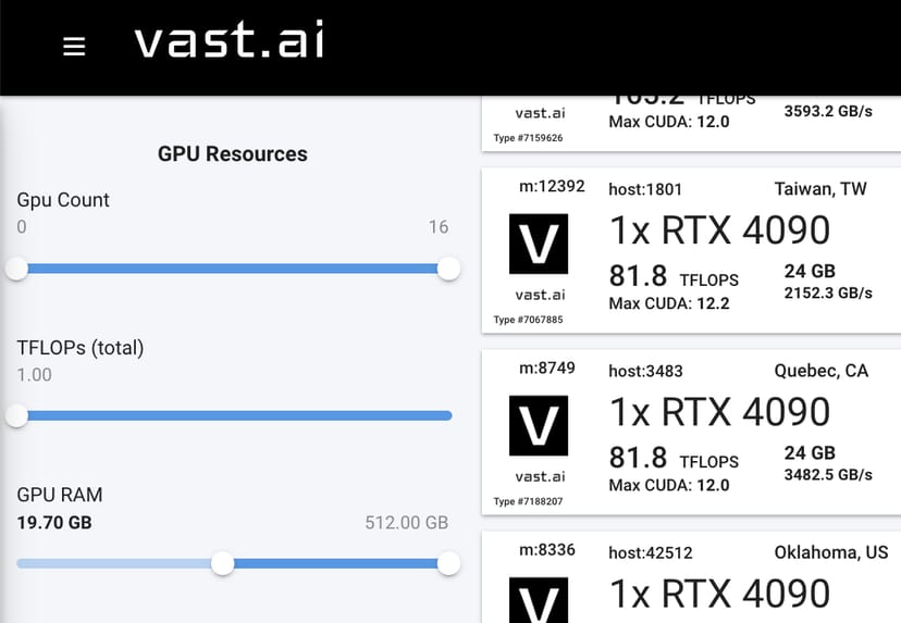 Vast.aiは、個人間でGPUサーバーを貸し借りするサイト。