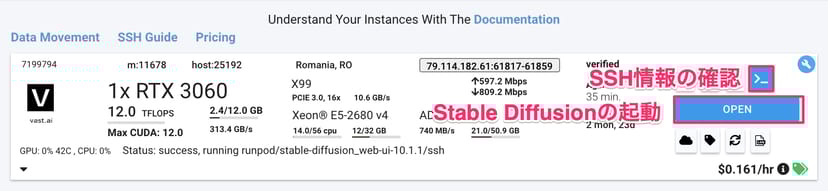 メニューの「INSTANCES」から起動したインスタンスを確認すると、SSH情報の確認と、Stable Diffusion web UIの起動ができる。