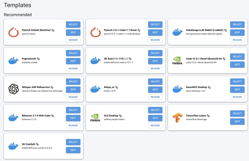 Vast.aiでは、ユーザーが利用したいツールに最適化された「テンプレート」を選択することで、必要なソフトやパッケージがプリインストールされた仮想マシンを起動する事ができる。