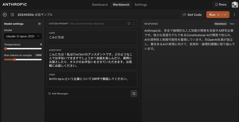 Workbenchのページを開いて、「User」のテキストボックスに、実際にClaudeに聞いてみたいプロンプトを入力し、右上の「Run」をクリックすると、モデルからの回答(RESPONSE)が得られる。