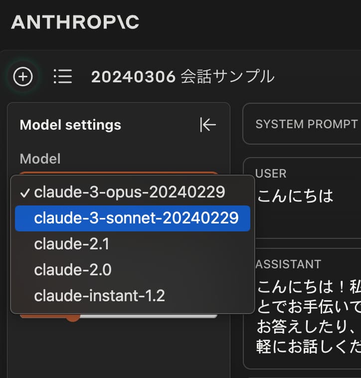 記事執筆時点では、Claude 3のOpus, Sonnetをはじめ、Claude 2.1などの旧モデルも利用することができるようになっている。