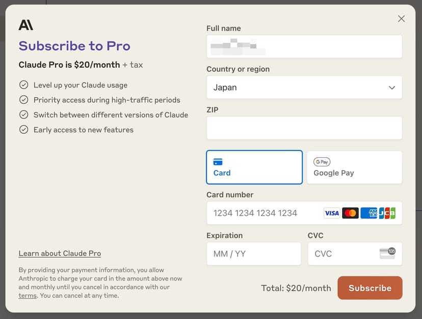 有料のClaude Proに登録すると、最上位のOpusモデルを利用することができるが、月額20ドルがかかる。