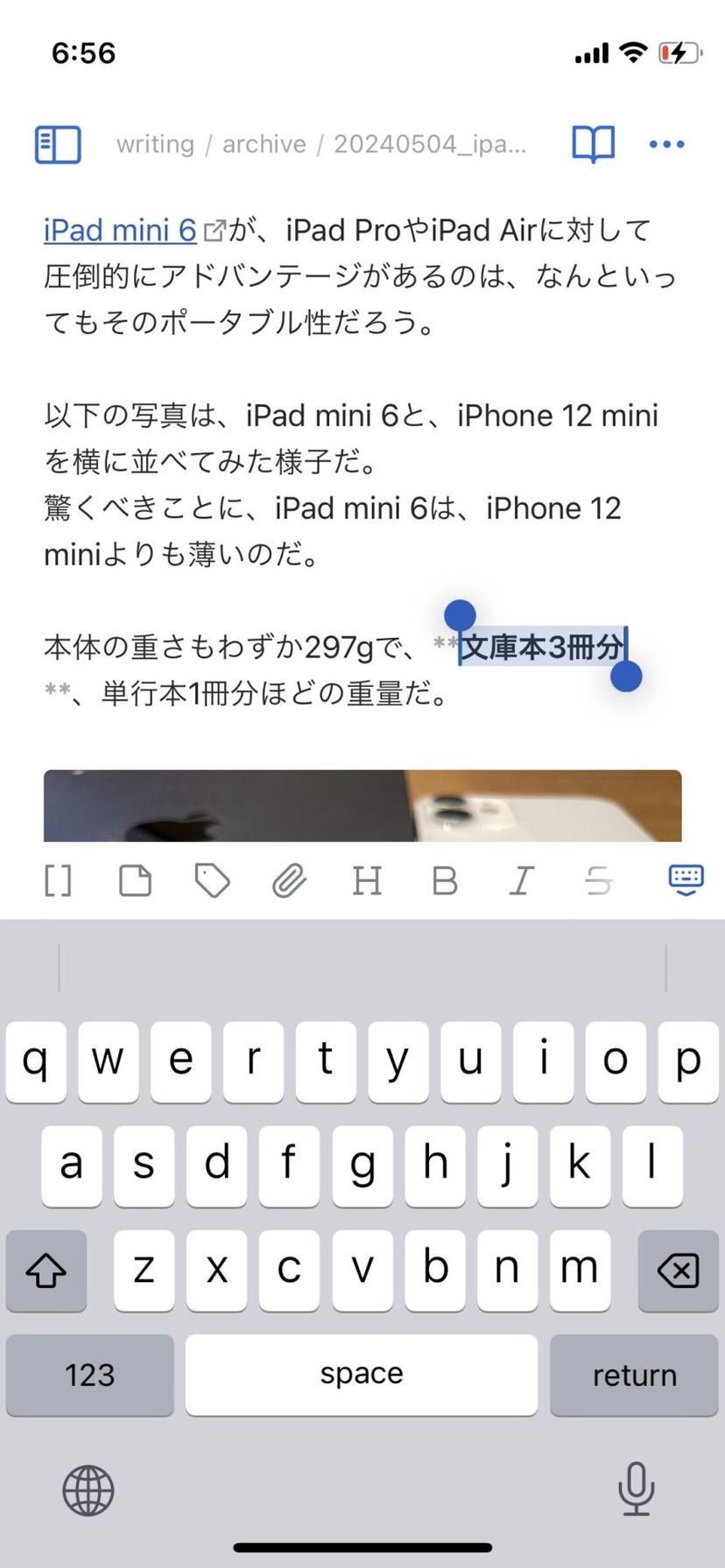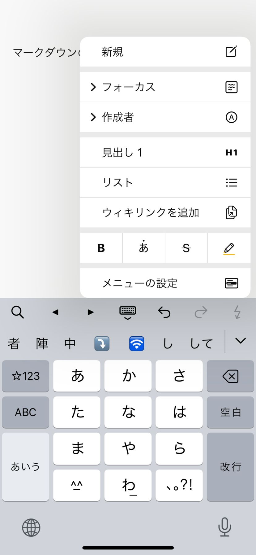 もちろん、これらを暗記しなくても、ObsidianではiPhoneのデフォルトキーボードの上にツールバーが用意されており、主要なテキスト装飾はワンタッチで呼び出せる。