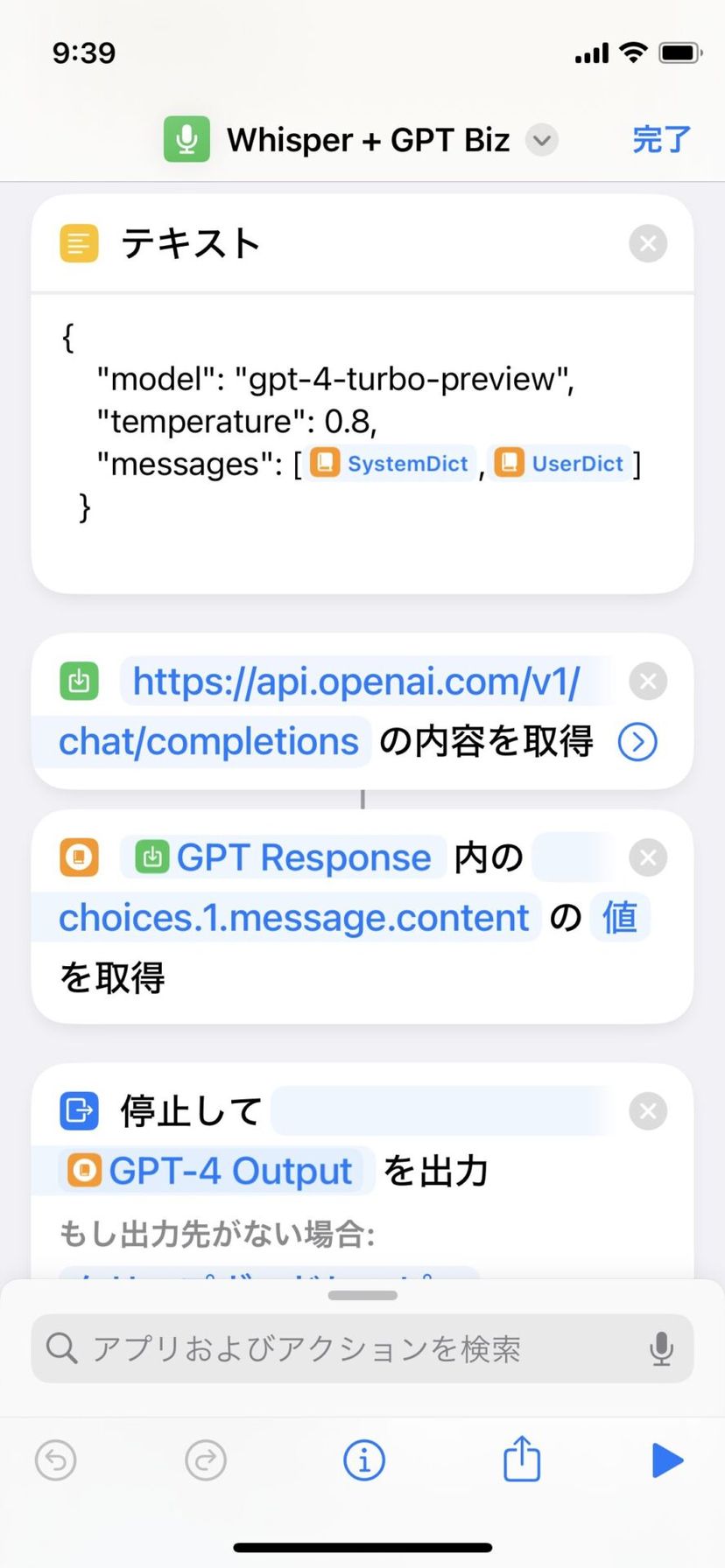 例えば、録音した音声を音声認識AIモデルの「Whisper」にテキスト化させた上で、OpenAIのAPIを使ってGPT-4に校正させ、複雑な言葉を含む音声でも、超正確に書き起こしてくれるショートカットを作ることまでできてしまう。