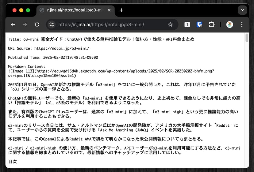 :/o3-mini/)をコピーして、冒頭にjinaのURLを足す(例:r.jina.ai/https://notai.jp/o3-mini/)。