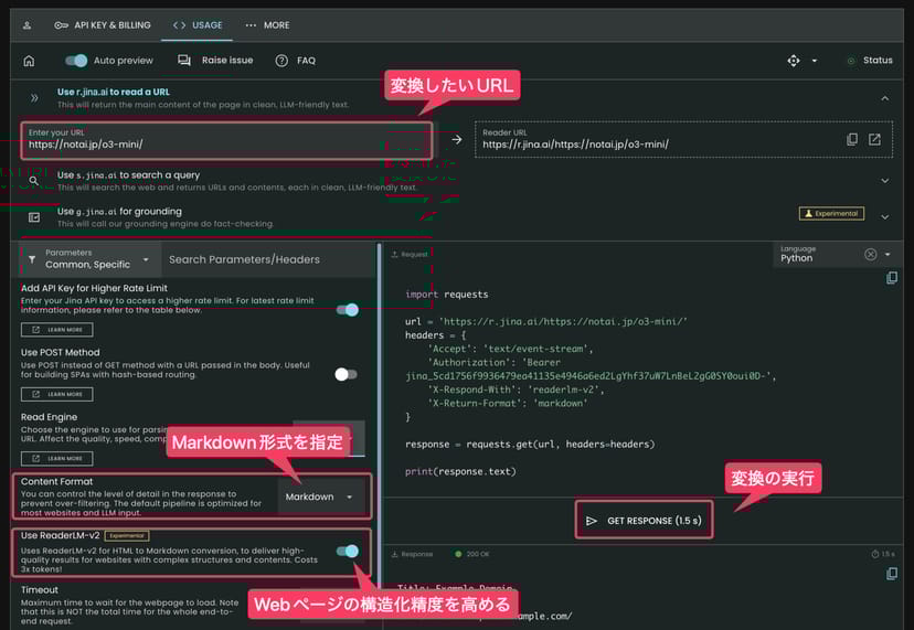 一方、Jina Readerの公式サイトにアクセスすると、より細かく設定を変更することが可能で、単なるプレーンテキストではなく、構造化したMarkdownテキストなどにも変換できる。