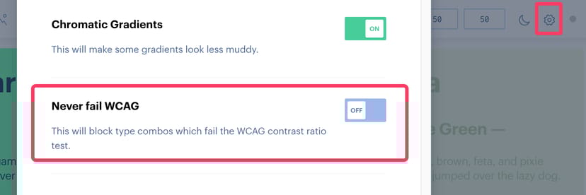 Khromaの右上にある歯車マークをクリックして設定を開き、「Never fail WCAG」をオンにすると、WCAG基準を満たさない色の提案が消える。
