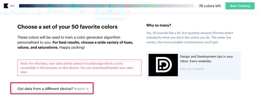 Khromaを開き直し、最初の50色を選ぶ段階で、「Import it」という箇所から先ほどダウンロードした.jsonファイルをアップロードすれば、保存したカラーパレットを復活させることができる。