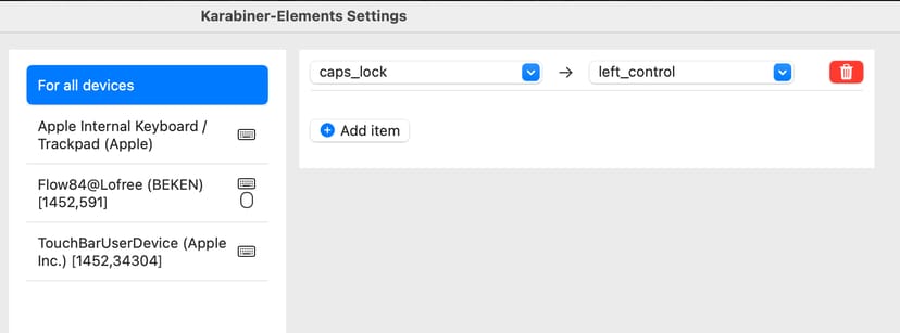 筆者の場合、Mac Book Air側でKarabiner Elementsというソフトを入れて、CapsLockキーをControlキーに割り当てたりしている。