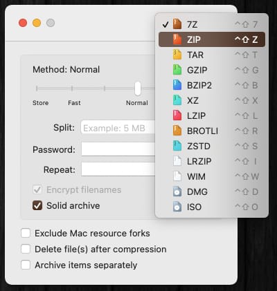 マイナーな圧縮形式にも対応している他、ファイルの分割も非常に簡単にできる。