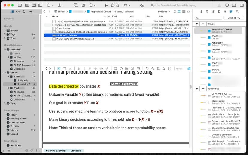 僕の場合、過去に大学院の授業のために調べたPDF、論文、プレゼン資料、Webサイトなどは全てDEVONthinkに突っ込むようにしていた。