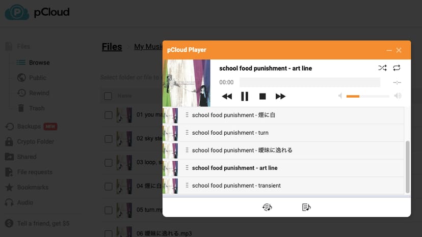ブラウザからpCloudにアクセスすると、直接音楽を再生したり、プレイリストを作成したりできる。