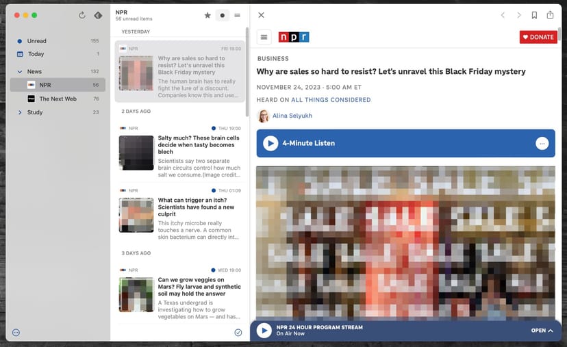iOS/MacOS全て共通で使えて、ライフタイムプランで3,500円と少し金額はかかるものの、一度買い切り型なので、RSSサービスとInstapaperなどの後で読むサービスを使っている人は、購入して損はないだろう。