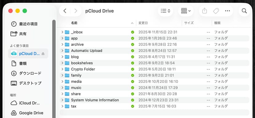 Macでは外付けドライブのようにpCloudをマウントして使用することができ、非常に使いやすい。