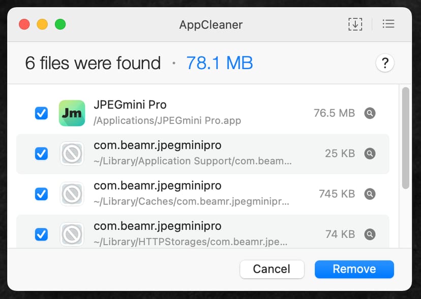 アプリケーションに関連するすべてのファイル(設定ファイル、キャッシュ、ライブラリファイルなど)を検出し、まとめて削除することができる。