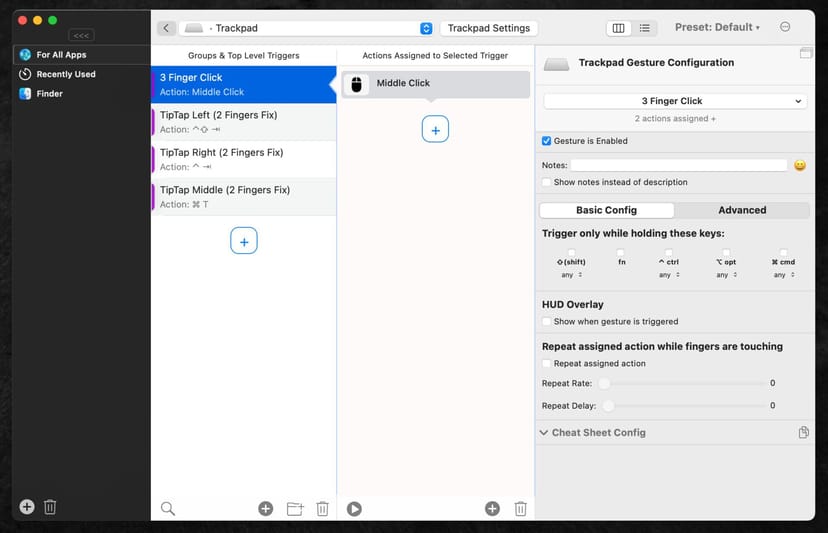 トリガー(ジェスチャーなど)とアクション(起動するコマンドなど)の組み合わせを自由に設定できるので、例えば3本指のスワイプでMission Controlを起動するなど、macOSで廃止されたジェスチャーを復活させることができる。