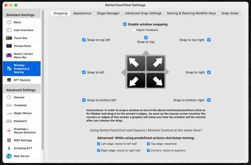 BetterTouchToolには、Windowsのウィンドウスナップ機能と同様の機能が含まれており、トラックパッドのジェスチャーを魔改造するのに加えて、ウィンドウスナップ機能がついてくるのも嬉しい。