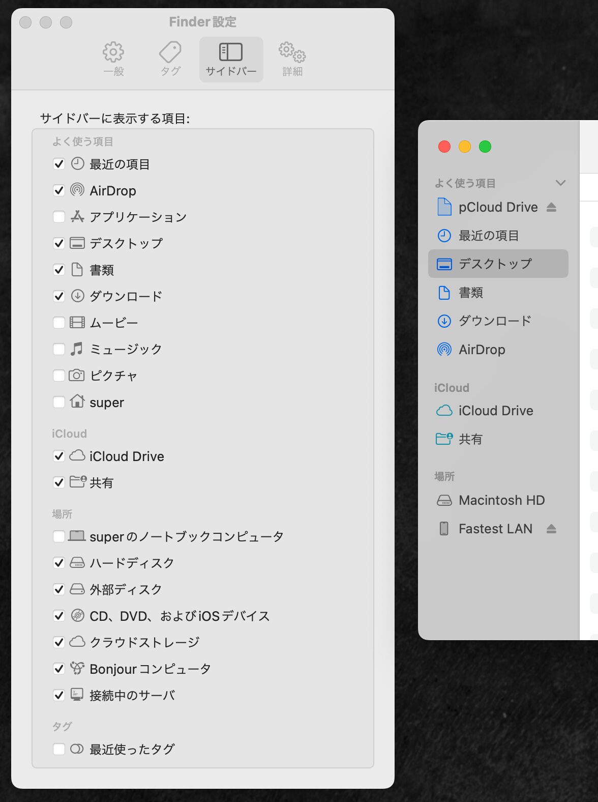 一方で、AirDropでiPhoneとの間でファイルを送受信したり、デスクトップ・書類・ダウンロードフォルダは非常に頻繁に使うので、サイドバーに常時表示しておくようにしてある。
