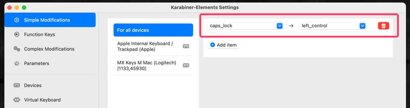 各人の好みに合わせて割り当てを変更したいキーを選べば良いが、筆者は以下のように、全てのデバイス共通で、CapsLockキーを、左コントロールキーに変更している。