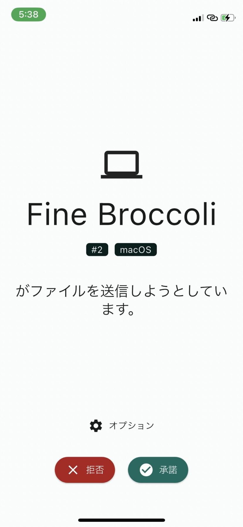 試しにMac側からiPhone側にファイルを送付してみると、iPhone側では以下のように受信するかどうかの選択画面が表示される。