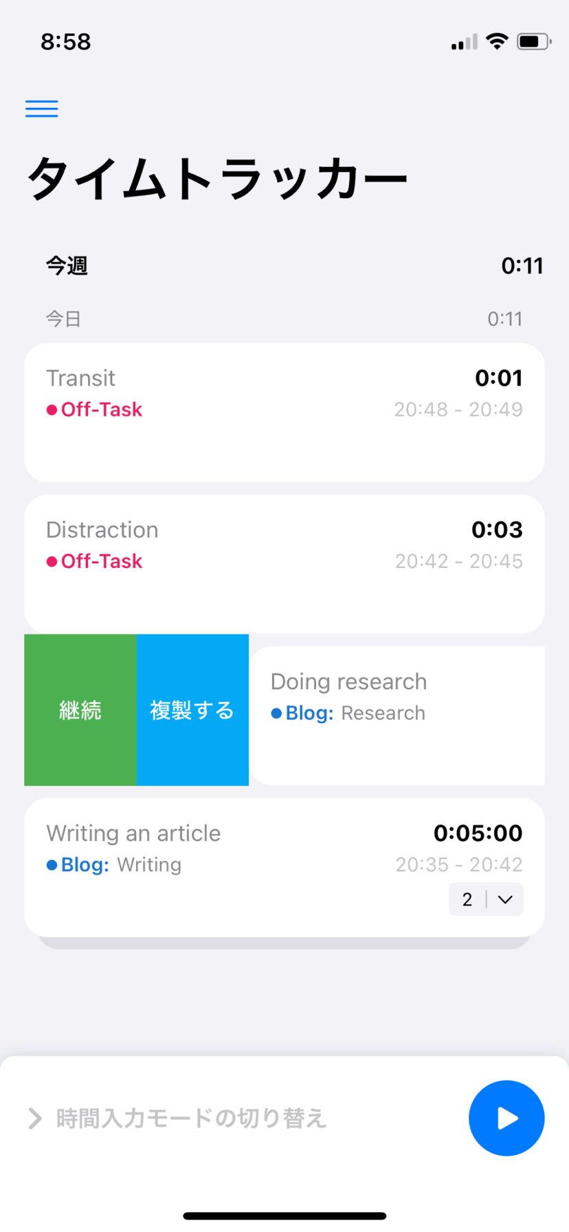例えば筆者の場合には、執筆作業をする「Blog」プロジェクトと、ダラけてしまった時間を記録する「Off-Task」プロジェクトを作る。