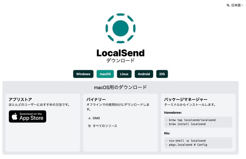 MacやWindows、Linuxであれば公式サイトにアクセスしてLocalSendをダウンロードできる。