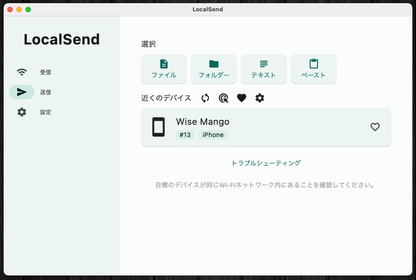 Local Sendを開くと、同じWi-Fiネットワーク内で、Local Sendをインストールしているデバイスが「近くのデバイス」に表示される。