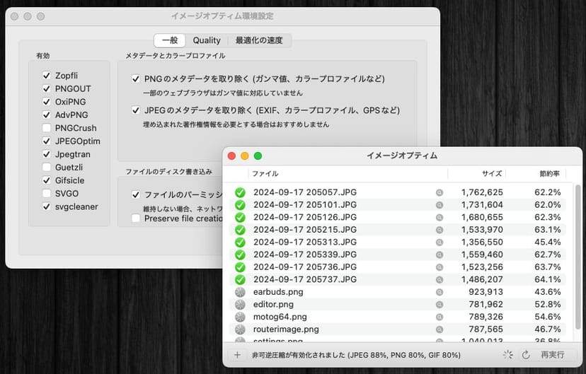 「ImageOptim」は、画像の容量を圧縮するアプリだ。画質の設定にもよるが、画像の見た目への影響が殆どないのに、ファイルサイズを50-60%程度に圧縮することができる。
