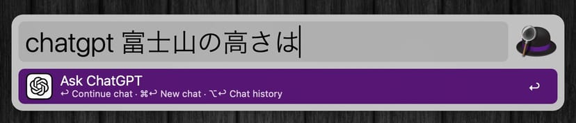 Alfredで、「chatgpt 質問」とコマンドを打ち込むだけで、ChatGPTからの回答が表示される。