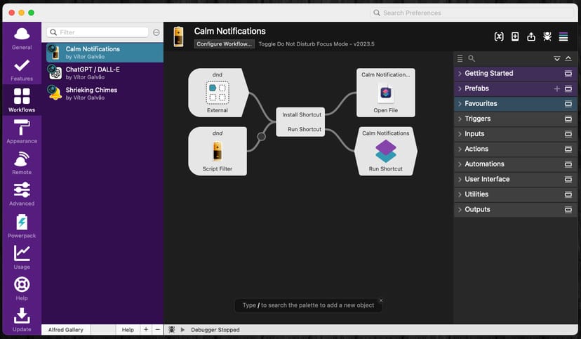 Alfred公式がChatGPT/DALL-E用のワークフローを用意してくれているので、誰でも簡単にインストールすることができる。
