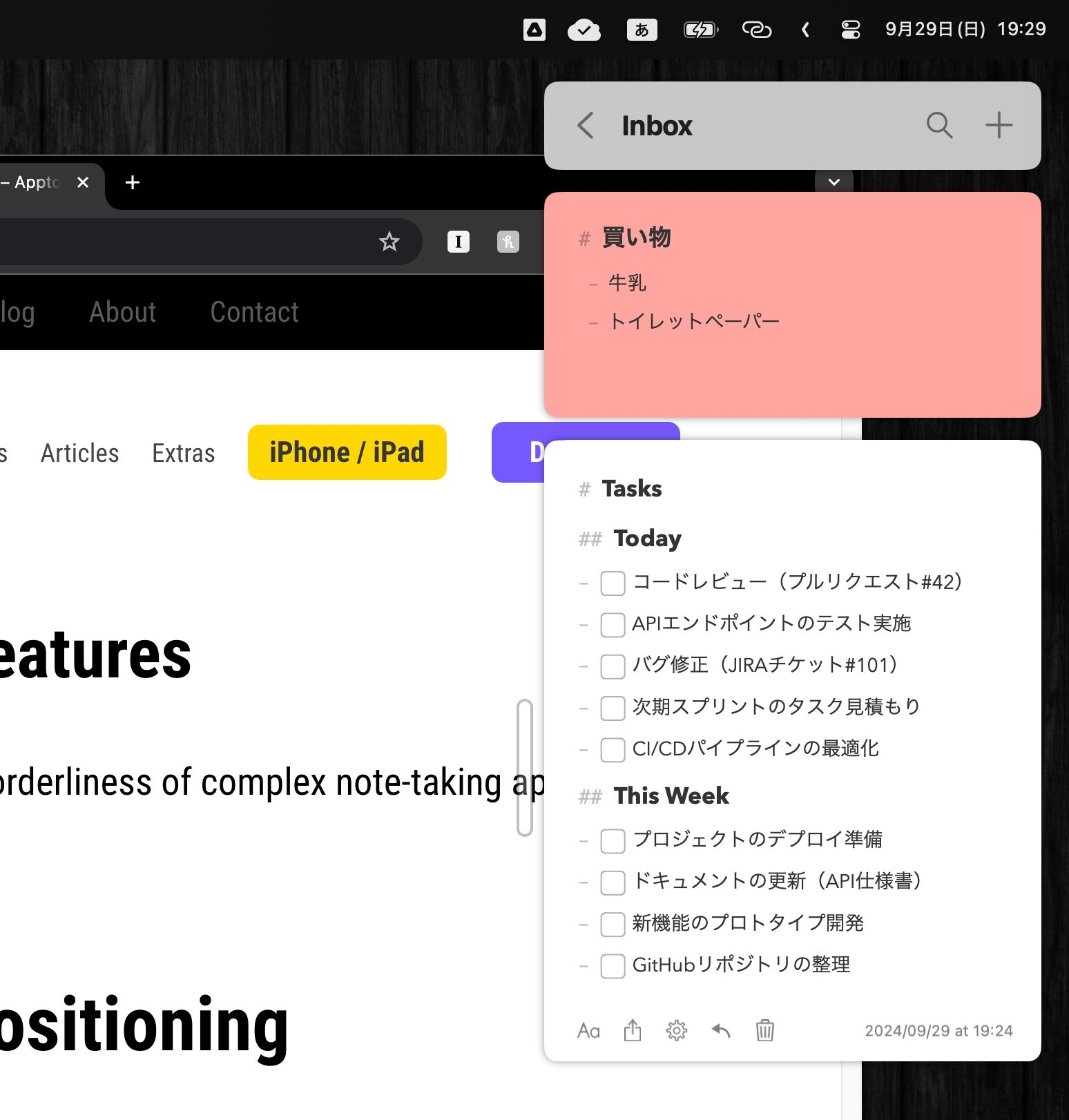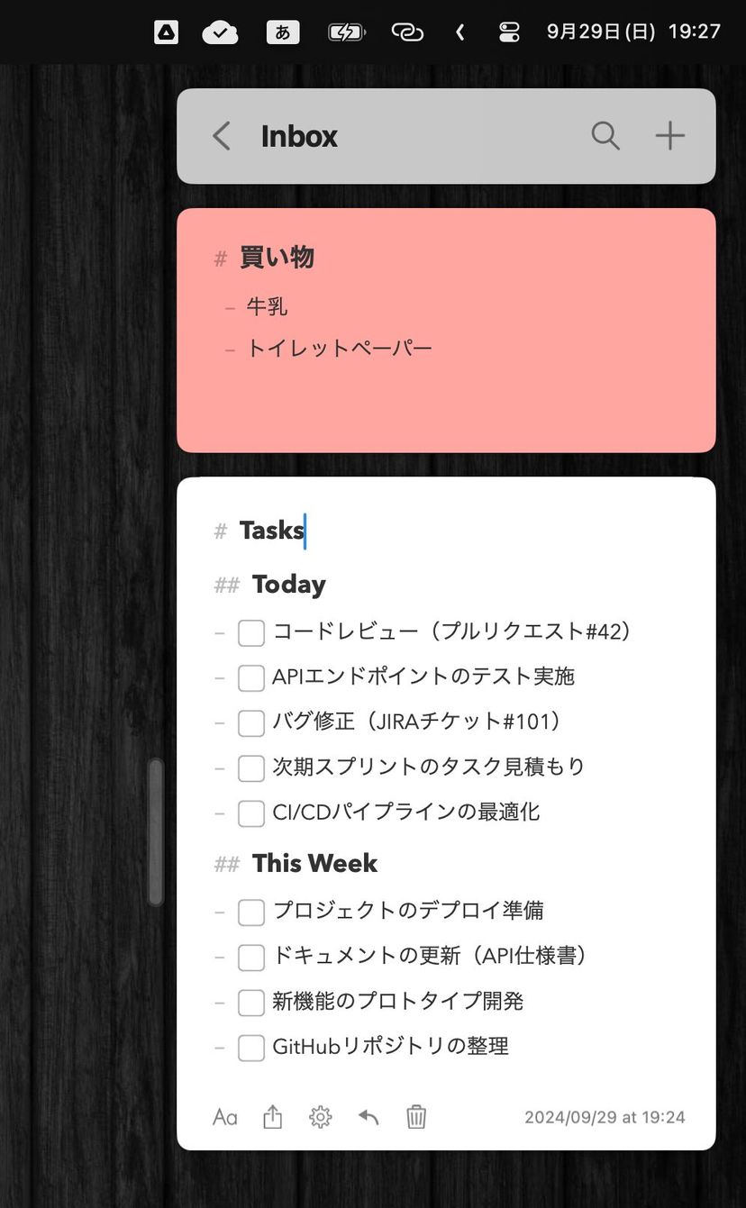 ノートはMarkdown形式で書くことができ、簡単に見出しをつけたり、箇条書きにしたり、タスクリストのチェックボックスを書いたりできる。