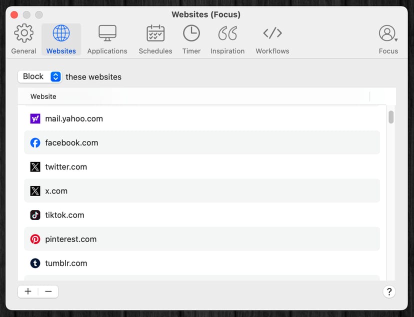 FocusがブロックするWebサイトは追加・削除も可能で、仕事上で必要なWebページなどはもちろん除外設定をすることができる。