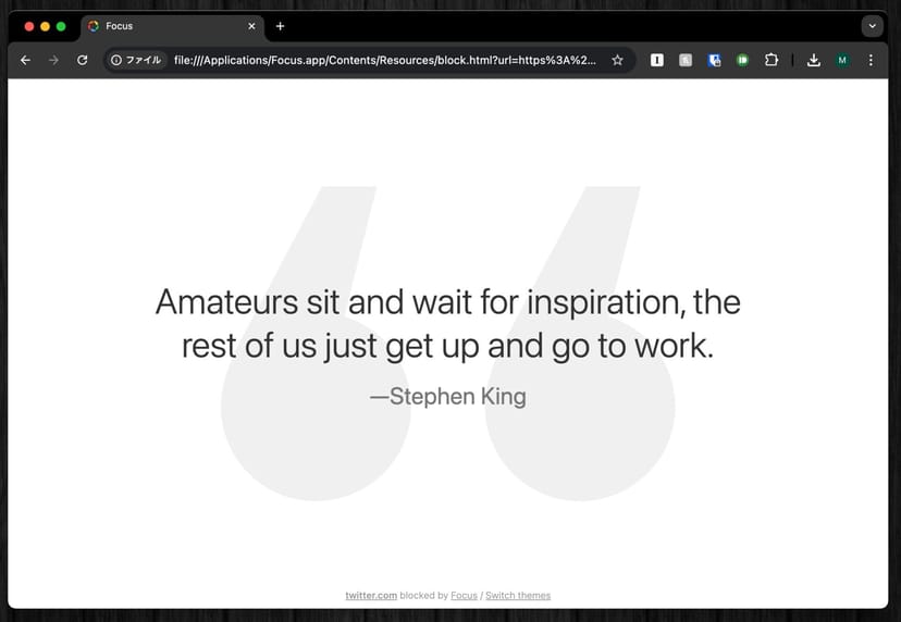 例えばFocusタイマーを起動中に、YouTubeを見ようとすると、以下のようにやる気が出そうな名言が表示されるだけで、YouTubeのURLを表示してくれない。