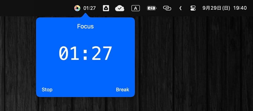 「Focus」は、Macのメニューバーに常駐し、ワンクリックで集中タイマーを起動することのできるアプリだ。
