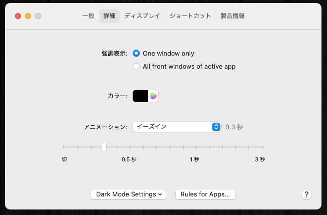 設定から、非アクティブウィンドウをどの程度暗くするかや、暗くするまでのラグなどを指定することができる。